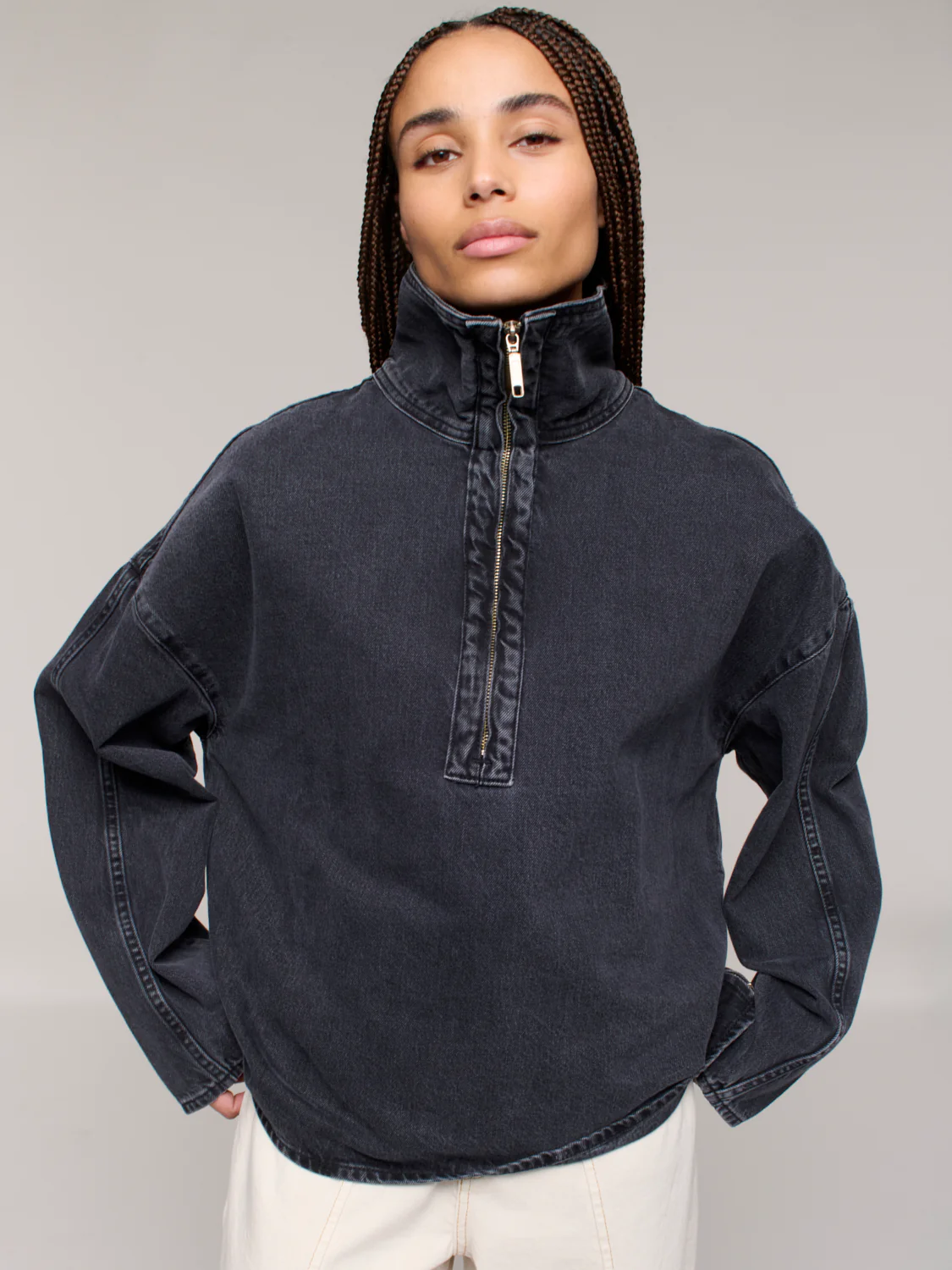 The Funnel Popover features a boxy, oversized fit with the perfect dropped shoulder. Designed with a half-zip funnel neck and side zip detailing, it's your go to layering piece for both style and versatility. Cut from rigid Italian denim in 100% organic cotton and washed with a low-impact process that reduces water and chemical use. Produced in Paraguay by BDA.