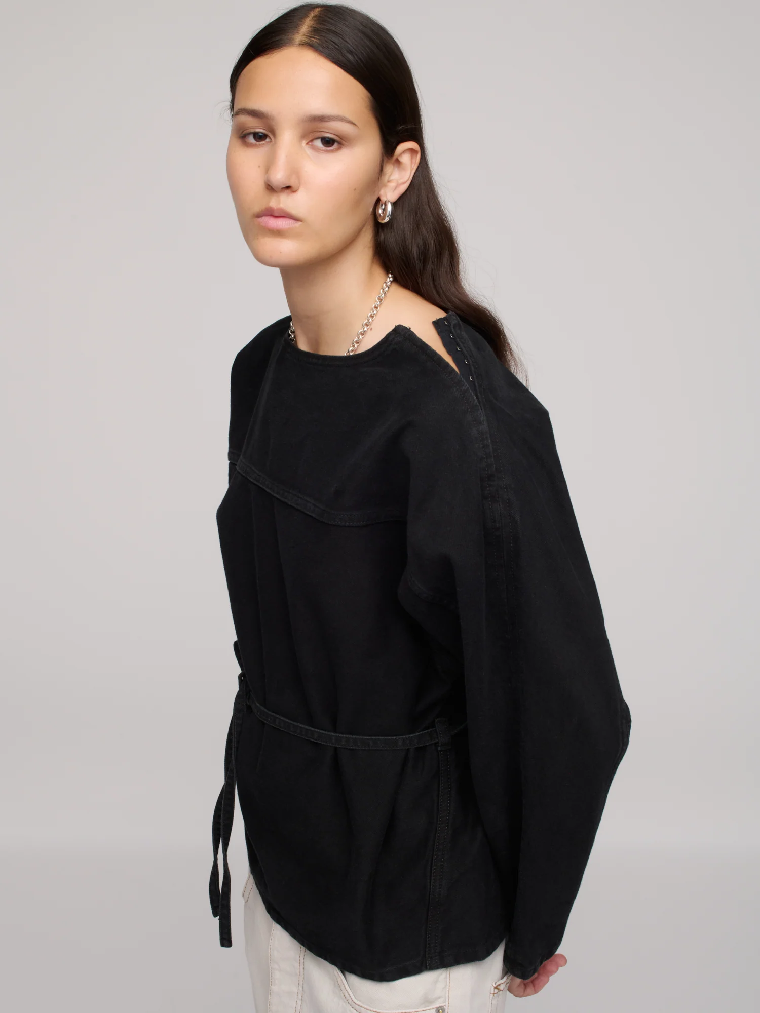 Designed with a boxy, relaxed fit, the Denim Sweat Top features a tie waist and hook-and-eye details at the shoulder. Made from rigid Italian denim in 100% organic cotton and washed with a low-impact process that reduces water and chemical use. Produced in Paraguay by BDA.