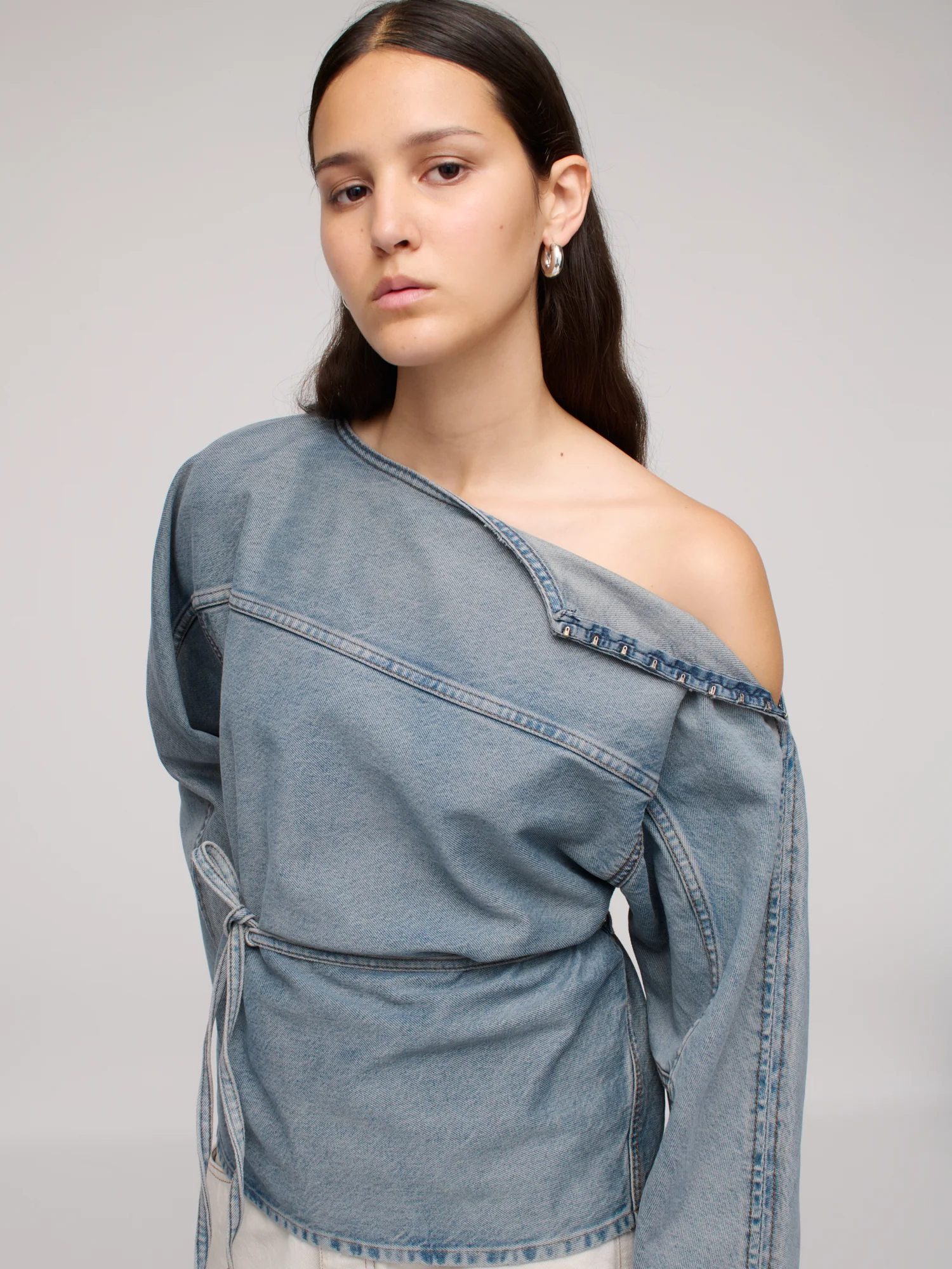 Designed with a boxy, relaxed fit, the Denim Sweat Top features a tie waist and hook-and-eye details at the shoulder. Made from rigid Italian denim in 100% organic cotton and washed with a low-impact process that reduces water and chemical use. Produced in Paraguay by BDA.