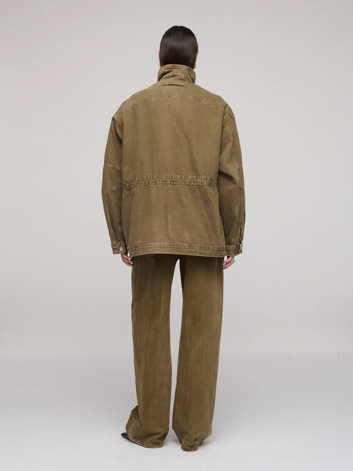 Designed with an oversized fit and subtle balloon sleeves, the Mountain Jacket features bellowed front pockets for utility, an adjustable toggle waist, and a double-ended front zip. Made with rigid Italian denim in 100% organic cotton, finished with a low-impact wash for a lighter footprint. Produced in Paraguay by BDA.