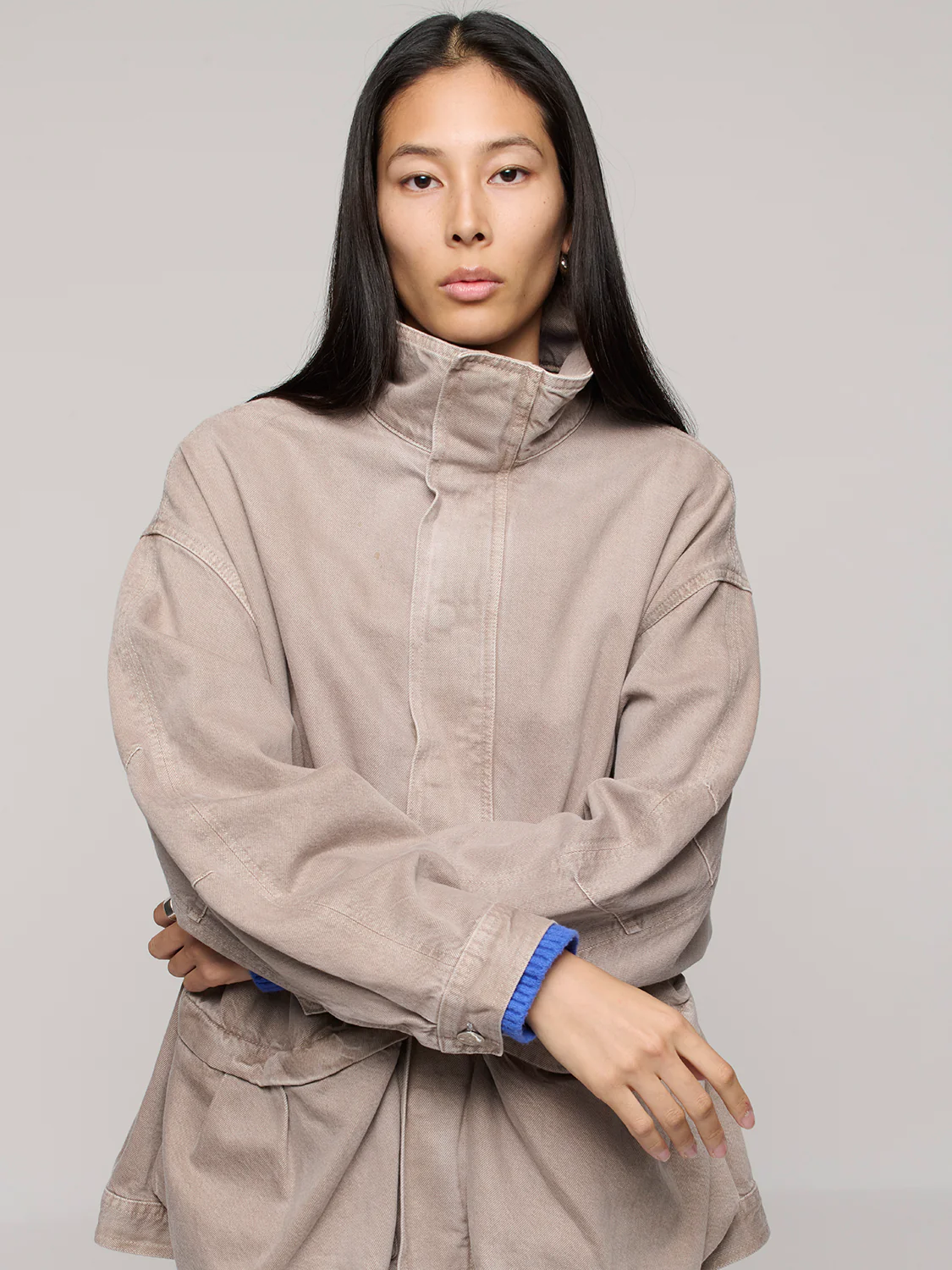Designed with an oversized fit and subtle balloon sleeves, the Mountain Jacket features bellowed front pockets for utility, an adjustable toggle waist, and a double-ended front zip. Made with rigid Italian denim in 100% organic cotton, finished with a low-impact wash for a lighter footprint. Produced in Paraguay by BDA.