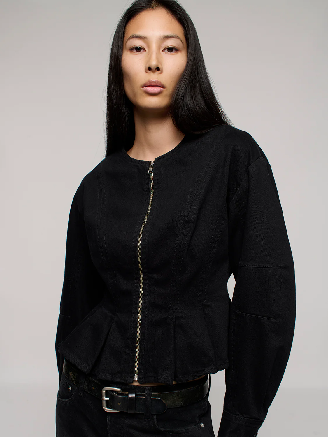 A structured jacket with a full-length front zip, subtle waist shaping, and a softly flared hem. Made with rigid Italian denim in 100% organic cotton, finished with a low-impact wash for a lighter footprint. Produced in Paraguay by BDA.