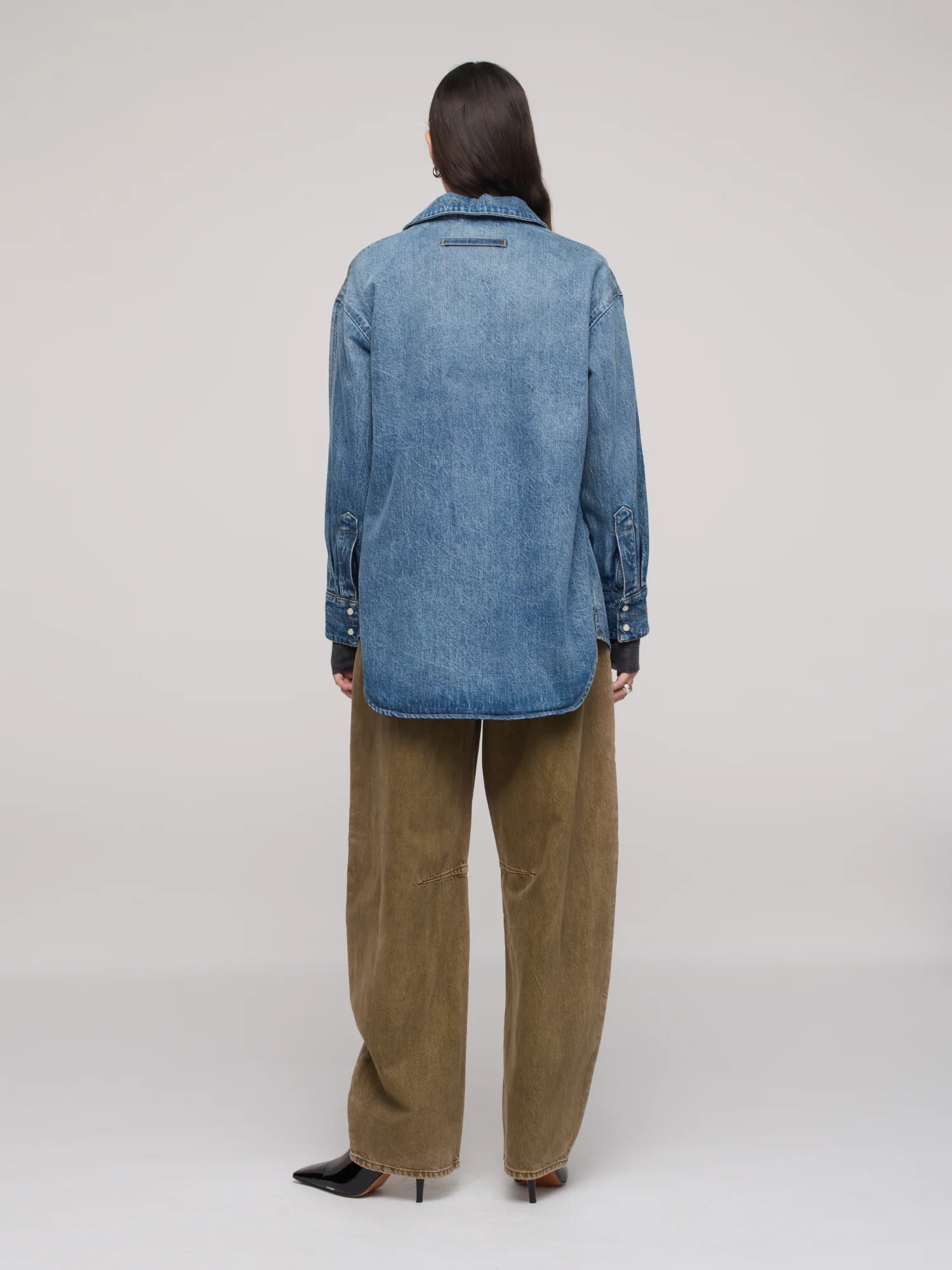 The Stack Shirt fits oversized with a full length sleeve, side splits at the seams and branded shank fastening. Cut from rigid Italian denim in 100% organic cotton and washed with a low-impact process that reduces water and chemical use. Produced in Paraguay by BDA.