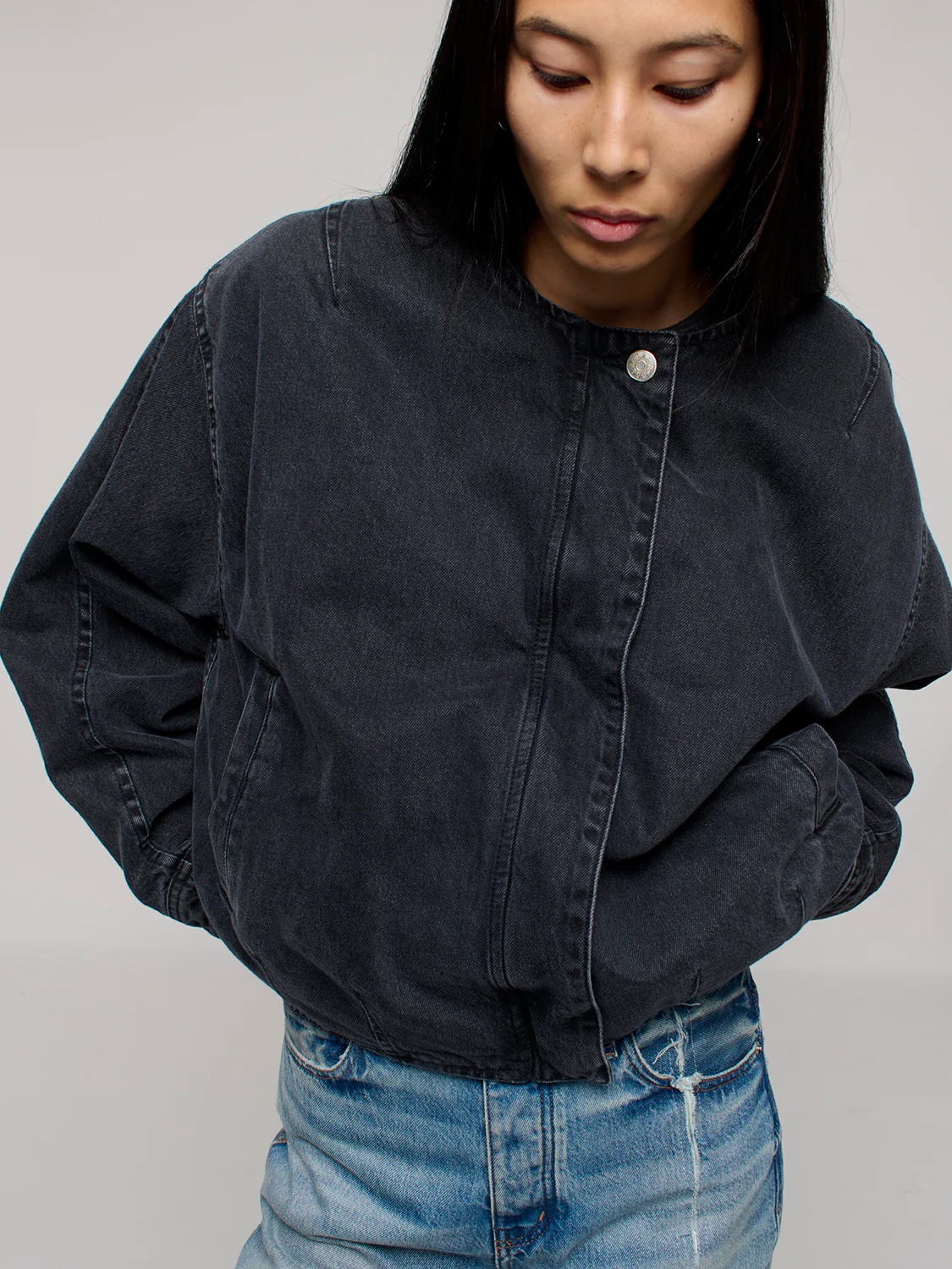 The Stills Jacket fits like a bomber featuring an oversized, boxy silhouette with dropped shoulders and voluminous sleeves, giving it a relaxed, everyday feel. Made with rigid Italian denim in 100% organic cotton, finished with a low-impact wash for a lighter footprint. Produced in Paraguay by BDA.
