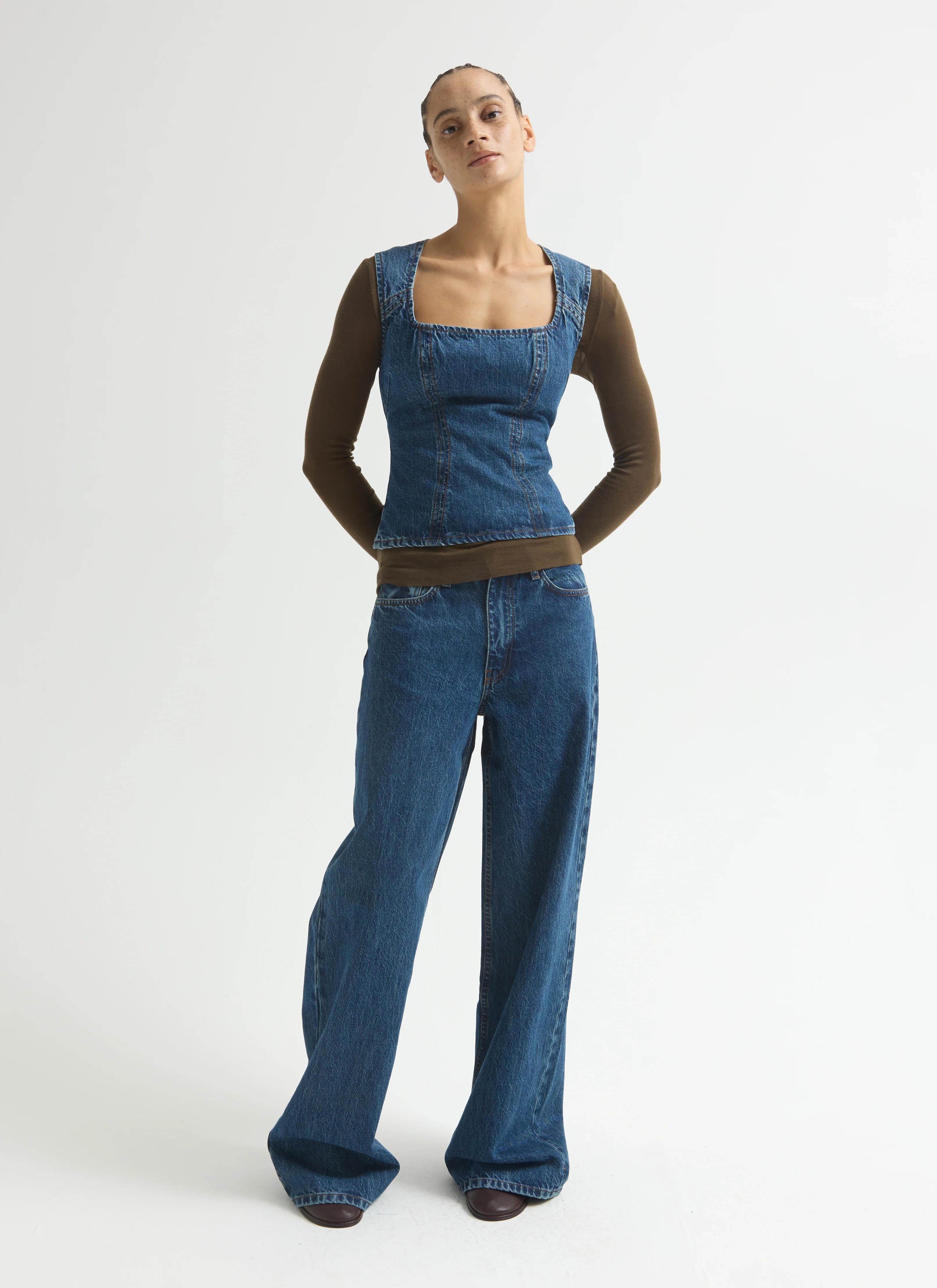 The Straddle Top features a square neckline with front seam detailing and a central back zip that hits just above the hip. Cut from rigid Italian denim in 100% organic cotton and washed with a low-impact process that reduces water and chemical use. Produced in Paraguay by BDA.